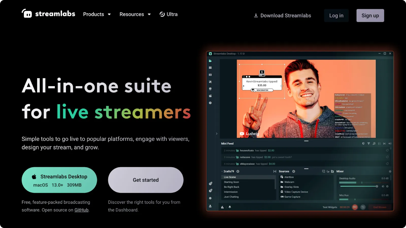 Streamlabs es otro software de streaming gratuito de código abierto creado a partir de OBS, pero con una interfaz más limpia y sencilla.