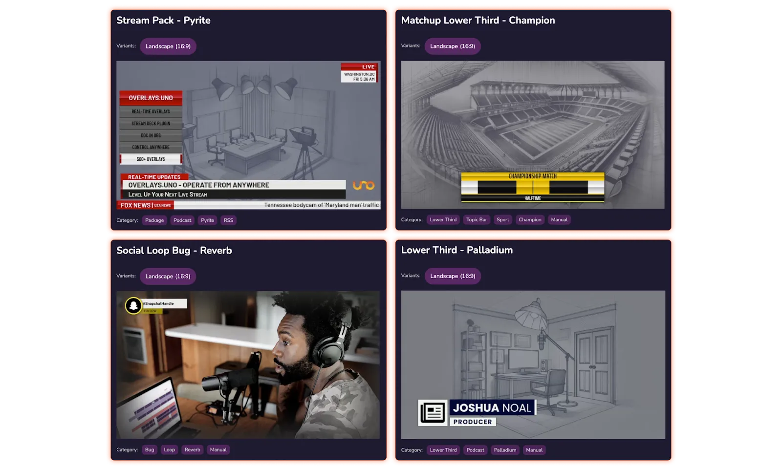 Una buena forma de mantener la atención del público durante un torneo en directo es asegurarte de que tu transmisión tenga un aspecto impecable y bien producido. ¡La buena noticia es que crear una transmisión en vivo atractiva no tiene por qué costarte un ojo de la cara! Con uno overlays, puedes agregar gráficos producidos profesionalmente a tu transmisión de forma gratuita.