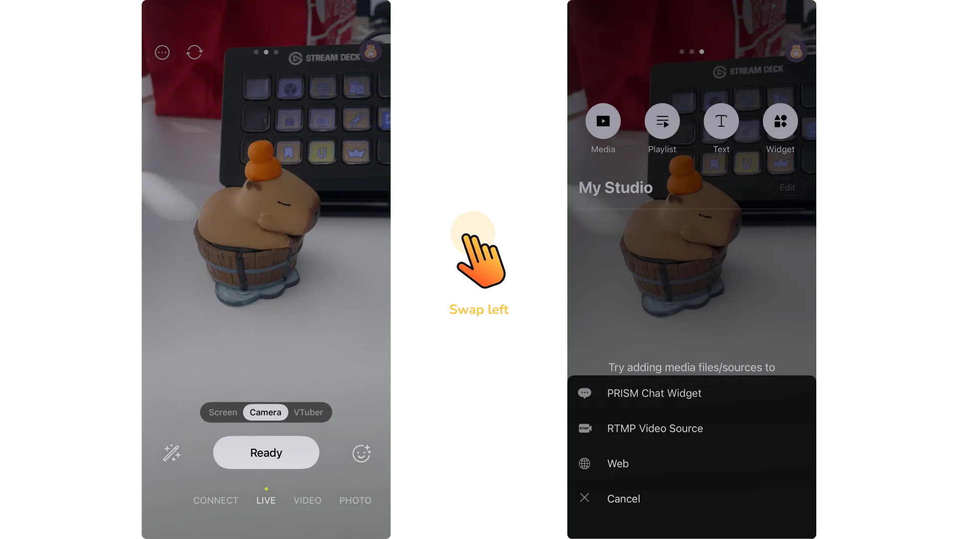 Prism Live Studio tiene varias funciones útiles, como la posibilidad de eliminar el fondo, añadir filtros de belleza y ofrecer plantillas de texto, integración de chat, listas de reproducción de música y más. Además, aunque la aplicación móvil está diseñada para la transmisión vertical, puedes cambiarla fácilmente a la transmisión horizontal. También puedes añadir fuentes de URL como widgets, ¡lo que significa que puedes usar superposiciones en línea en tu transmisión en directo!