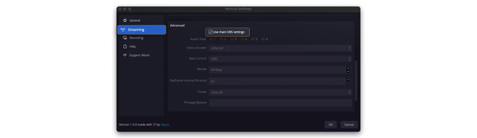 5. Scroll down to “Advanced”. Make sure that the “Use main OBS settings” is checked.