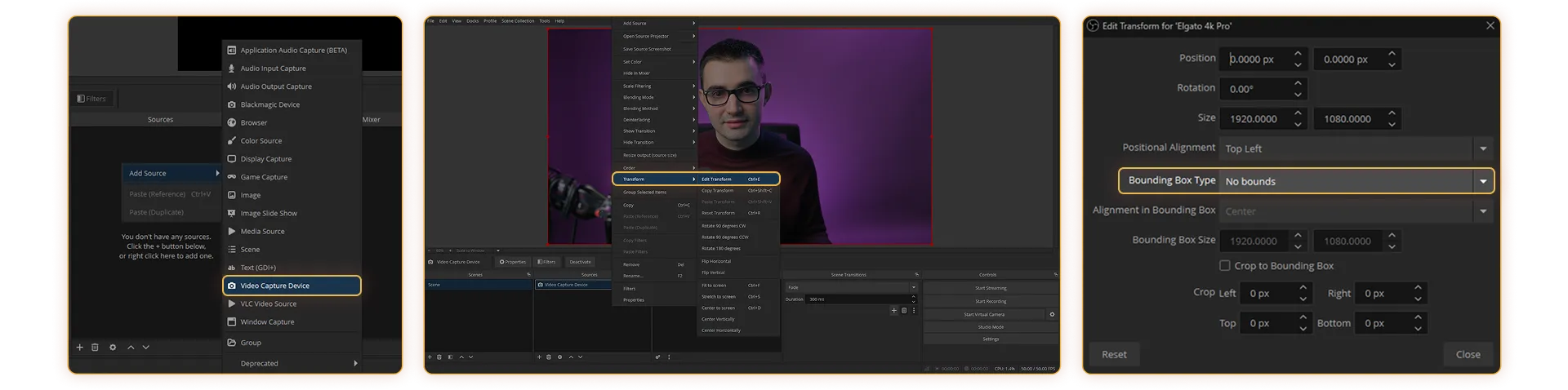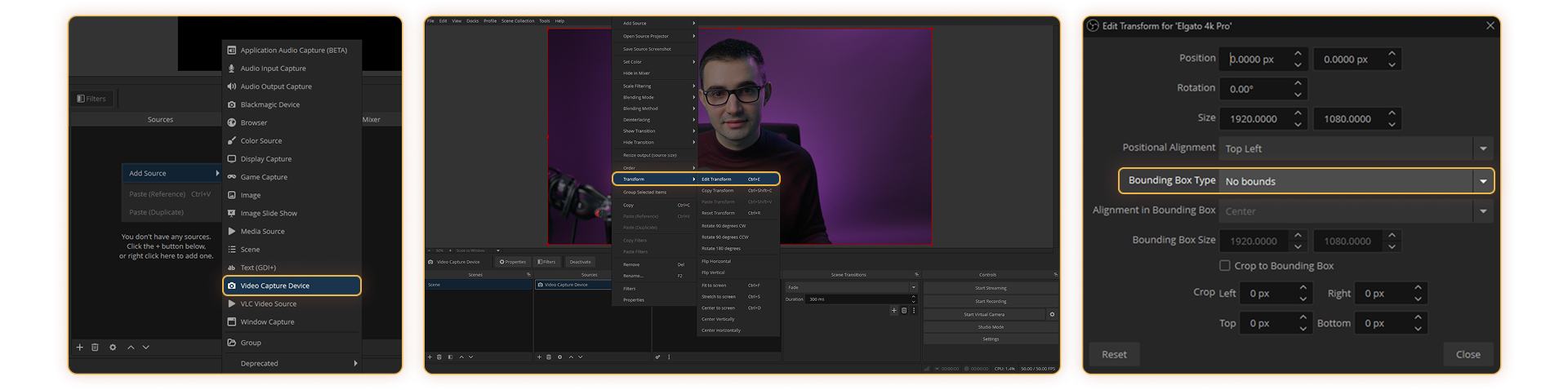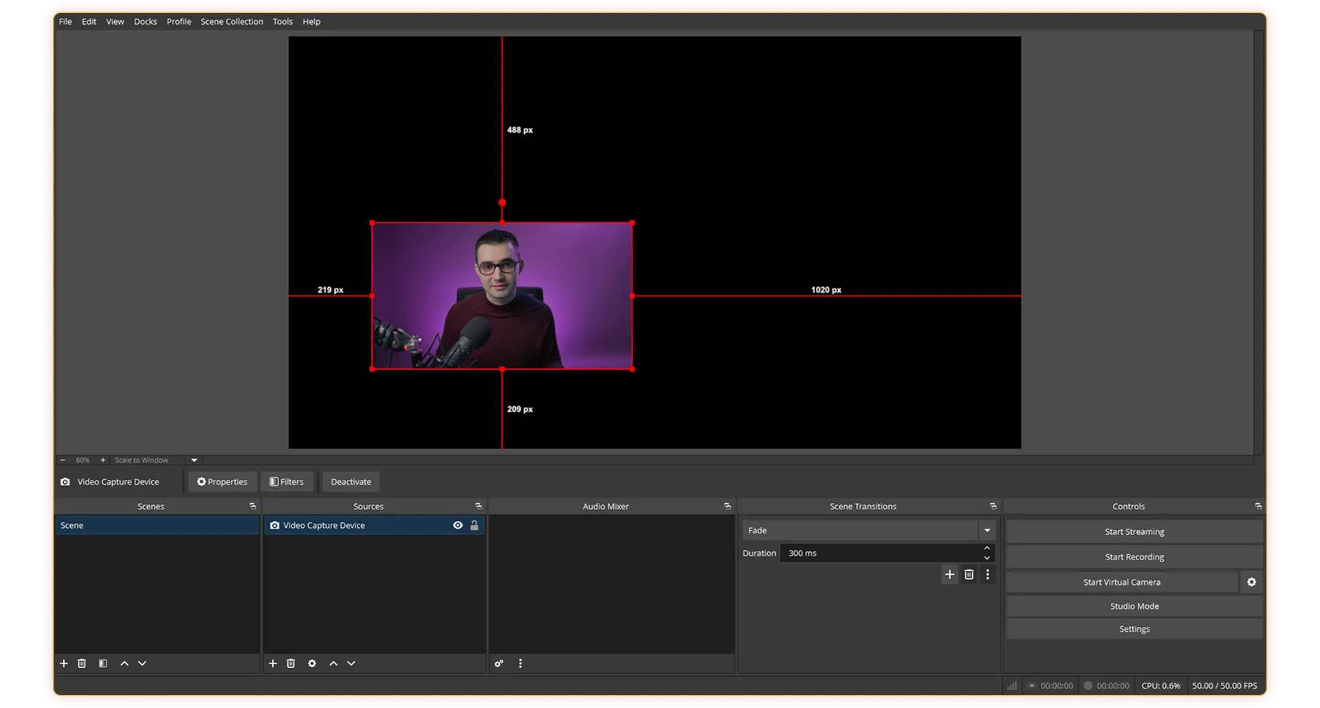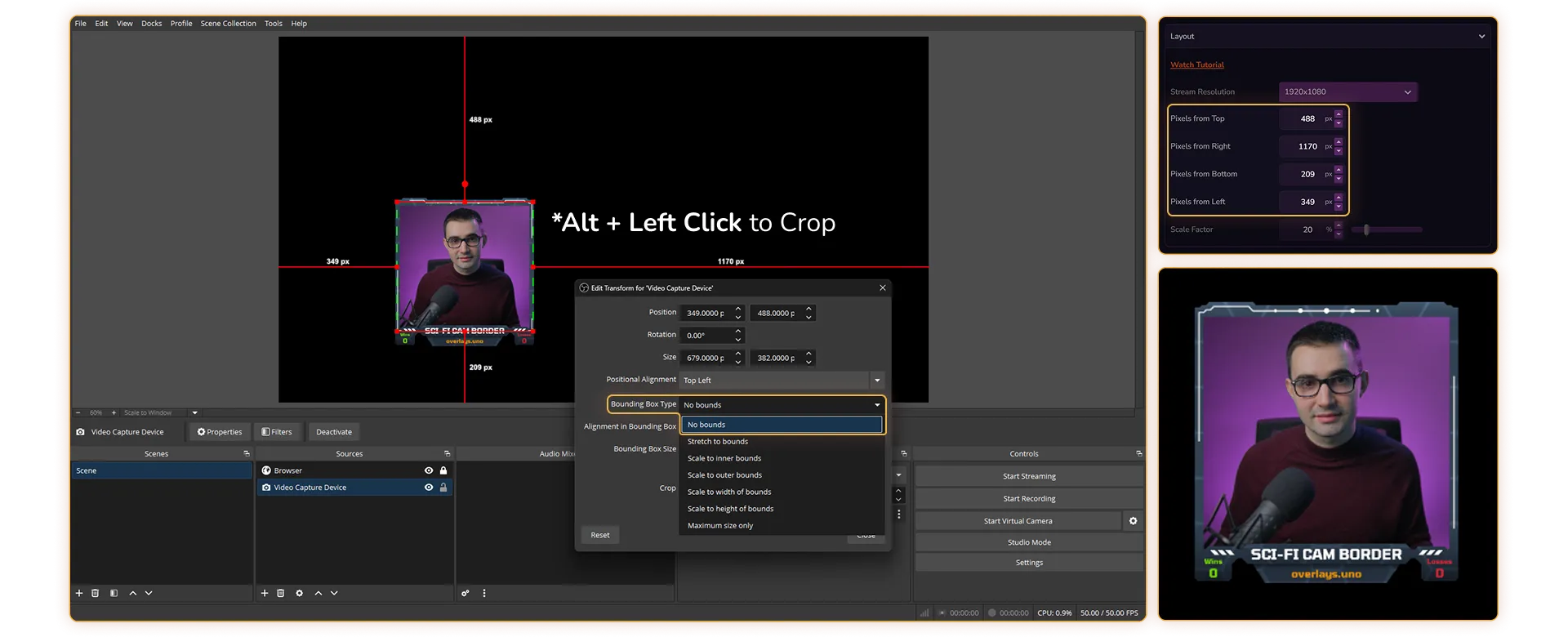 If you want to crop the webcam to a square aspect ratio, use Alt + Left Click when cropping from any side, and again make sure to set the Bounding Box Type to No bounds. Otherwise, the cropped sides won’t show the correct pixel values that you need to copy over to Top / Right / Bottom / Left Pixels.