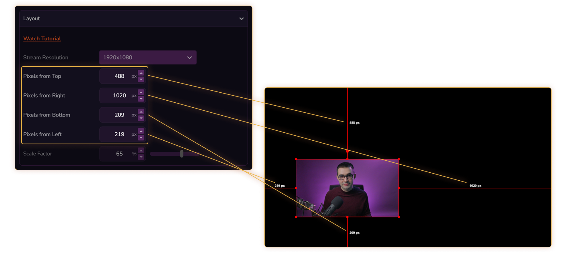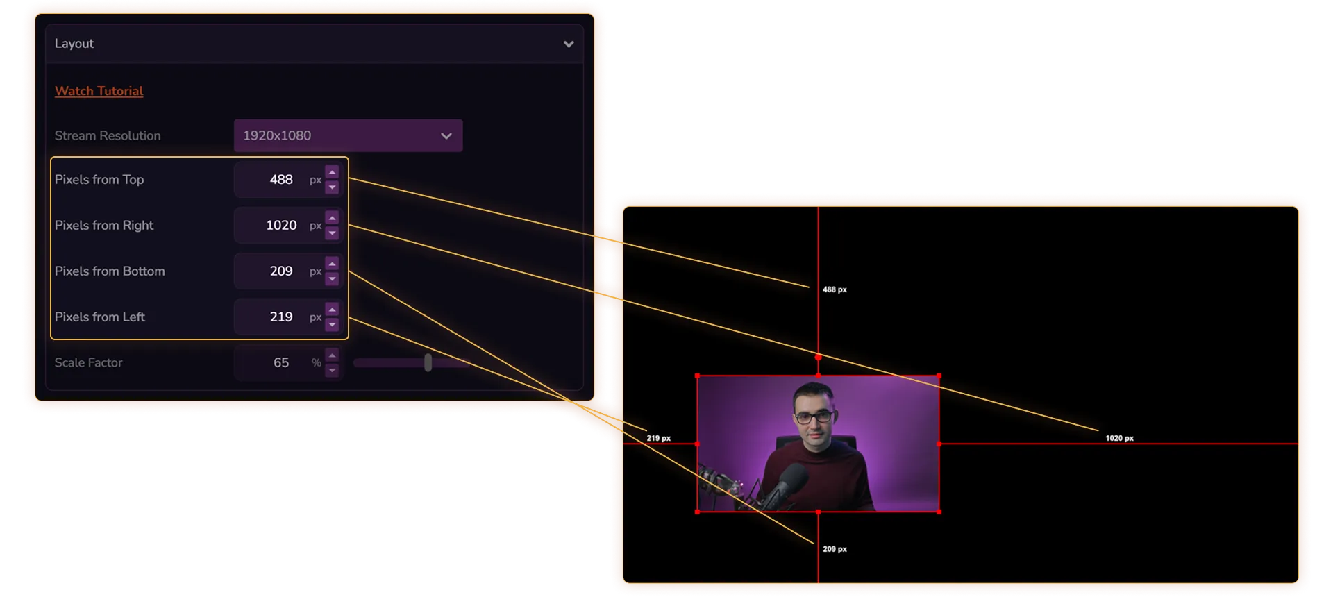 Set Top/Right/Bottom/Left pixels to match the webcam's position and size.